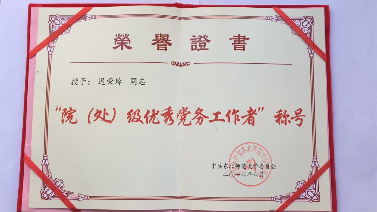 2016年6月,迟荣玲获得东北师范大学“院(处)级优秀党务工作者”荣誉称号